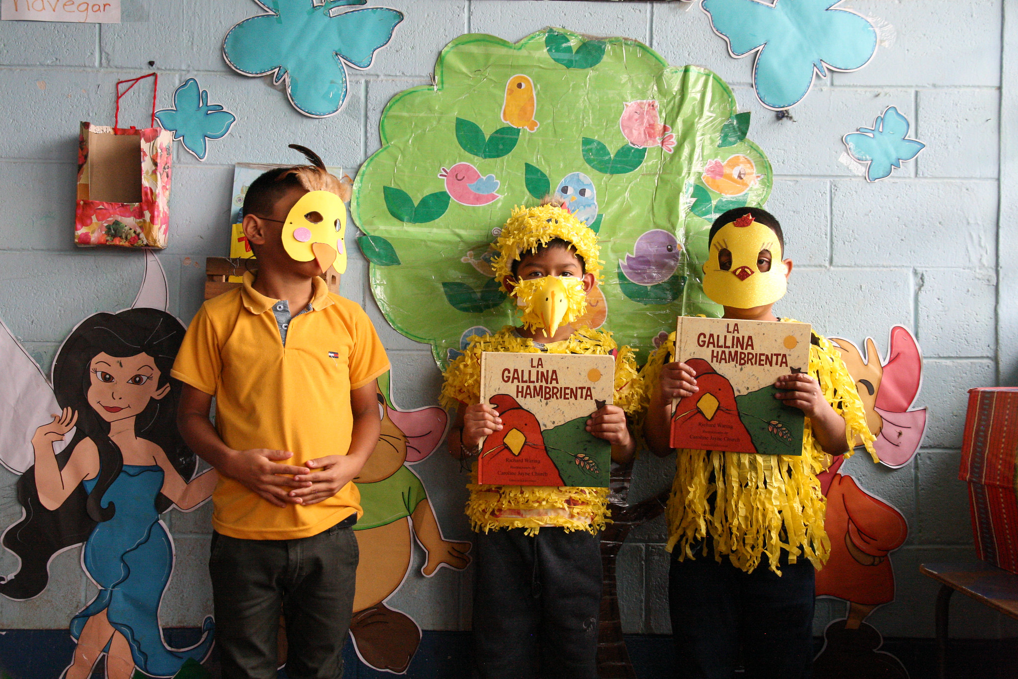 Elementary age Spark reading program students, dressed in fun chicken costumes to engage in reading a children's story together in the classroom