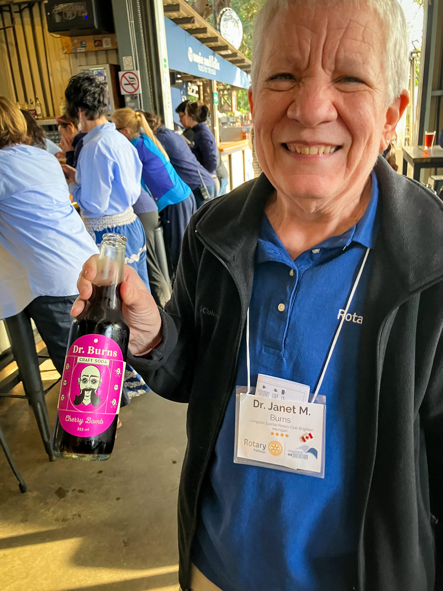 Somewhere between school visits and mountain drives, Dr. Burns saw something that made everyone laugh: a local soda brand with her exact same name!